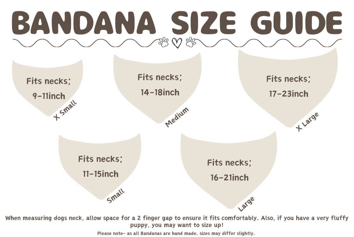 When measuring your dog's neck, allow space for a 2 finger gap to ensure it fits comfortably. Also, if you have a very fluffy puppy, you may want to size up! Please note: as all bandanas are handmade, sizes may differ slightly.