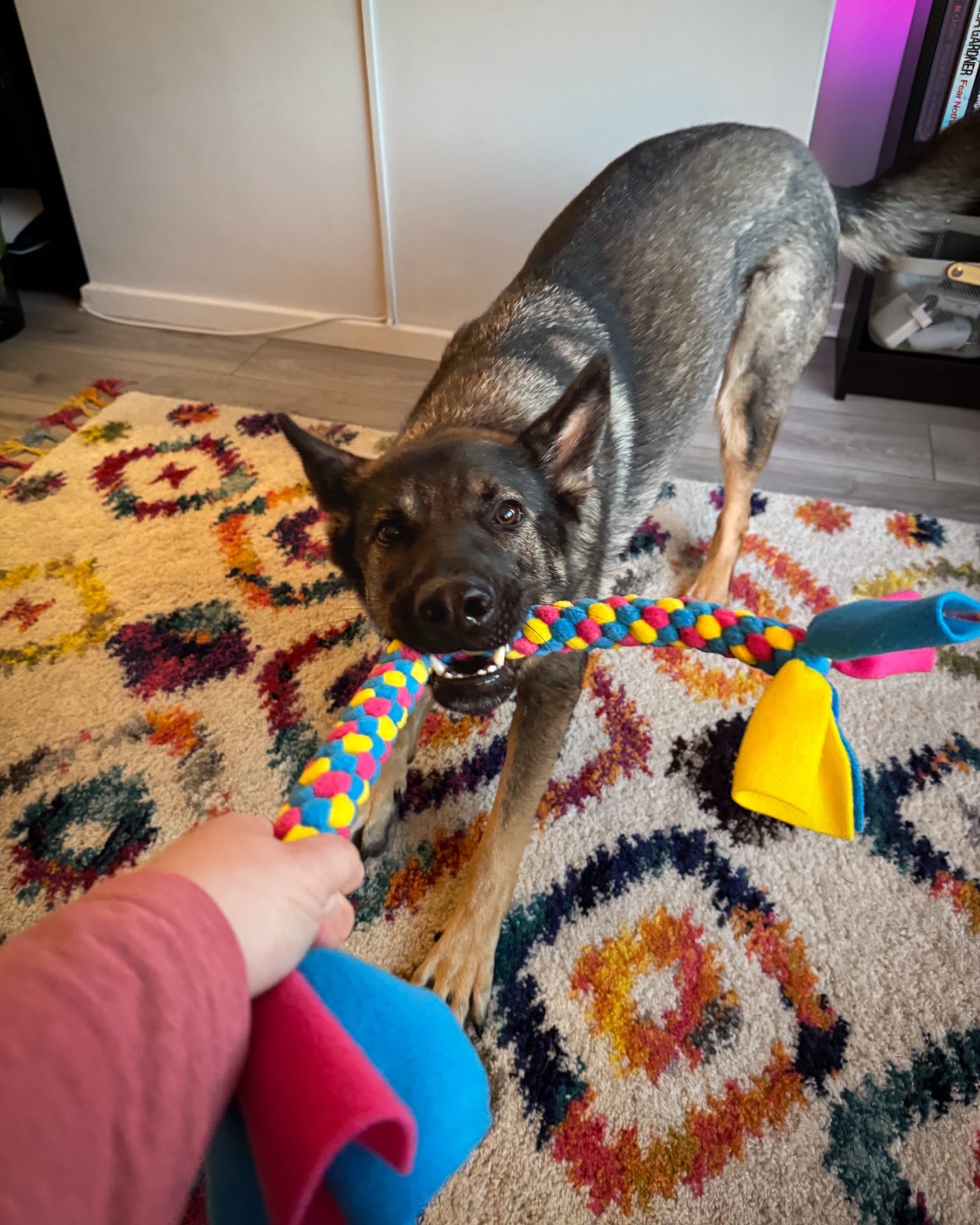 We brought the XL spiral tug toy so our Doberman and ridgeback could enjoy play time with more than enough length of toy to play tug of war with, but also so us humans could play tug of war with them too without worrying too much about the material giving in as well as binding with our furbabies. Cainine Crafts toys are always high quality toys, durable and washable! We love ordering from them, it’s a speedy delivery too!